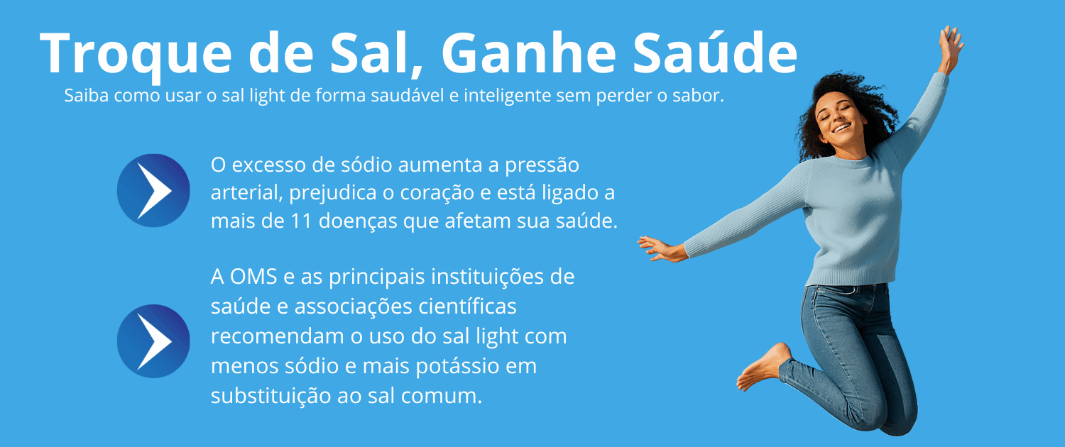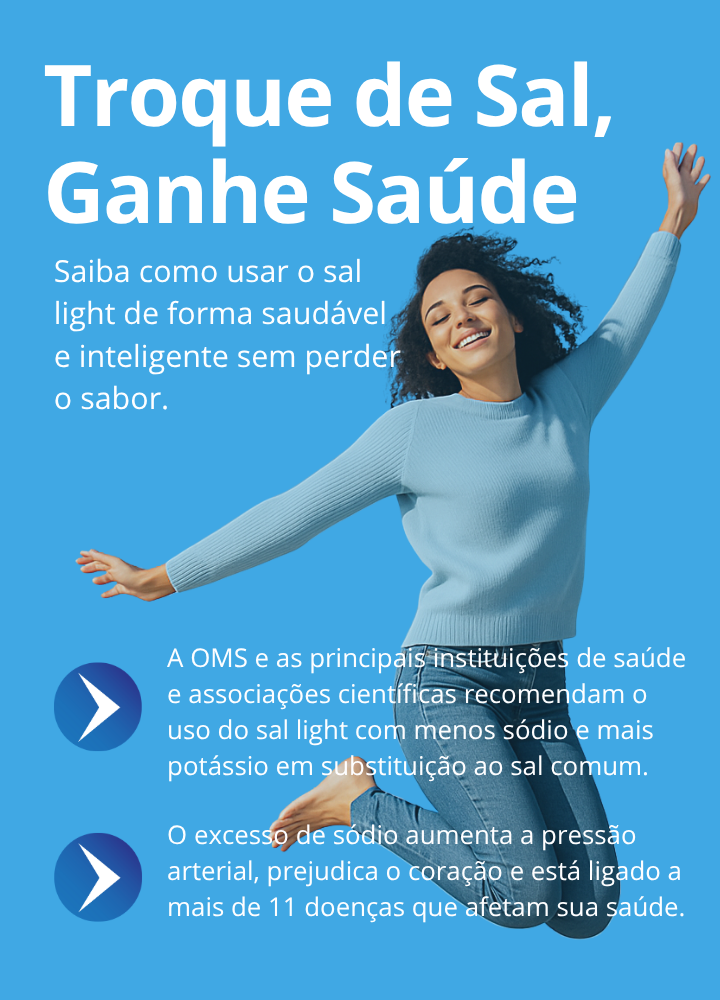 A campanha #TrocaDeSal visa conscientizar sobre os riscos do consumo excessivo de sal e incentivar a substituição do sal comum por sal light, um sal reduzido em sódio e enriquecido com potássio, contribuindo para a redução da pressão arterial e a prevenção de doenças cardiovasculares.